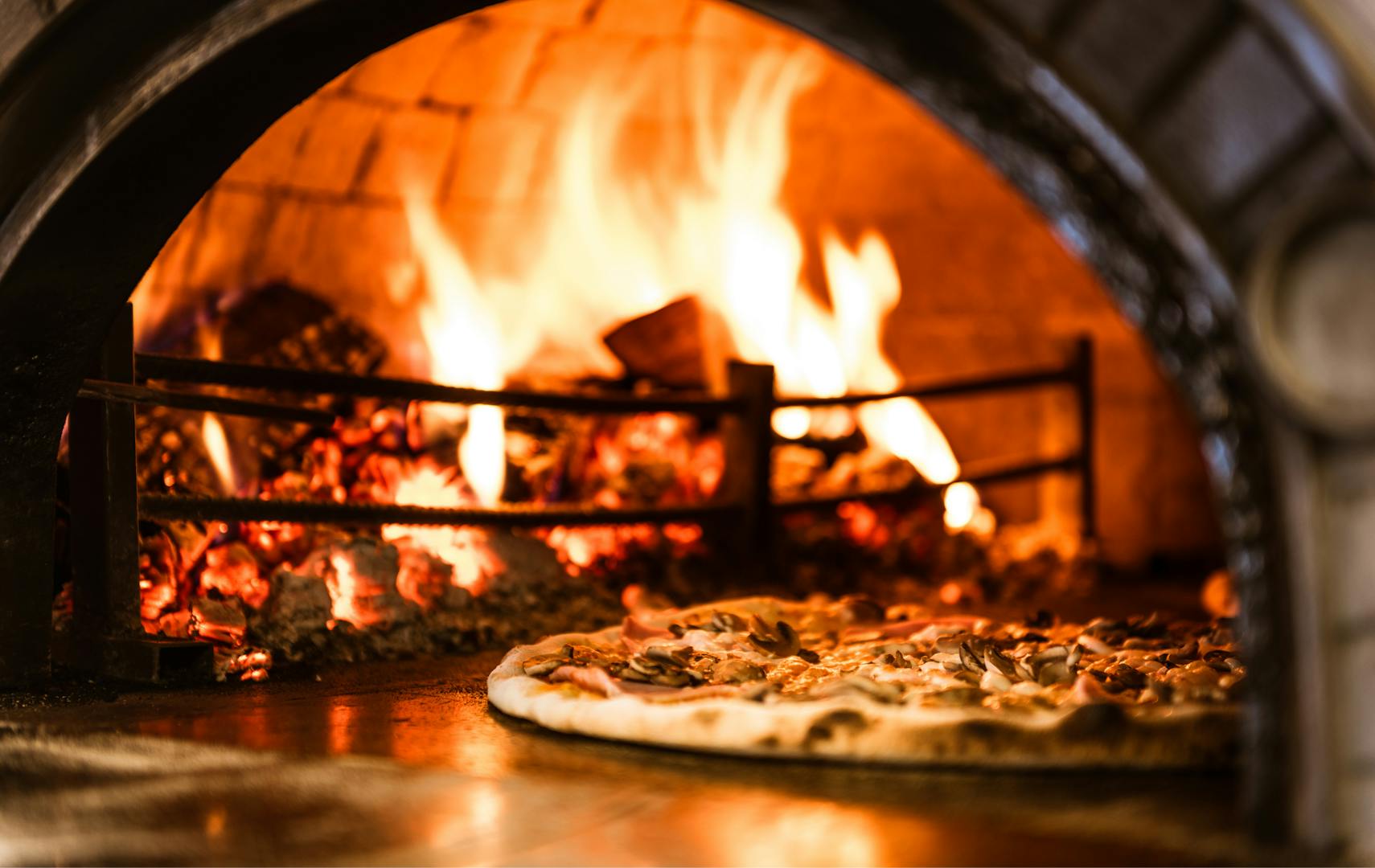 Nasza pizza wypiekana jest w piecu opalanym drewnem w temperaturze około 400 stopni.